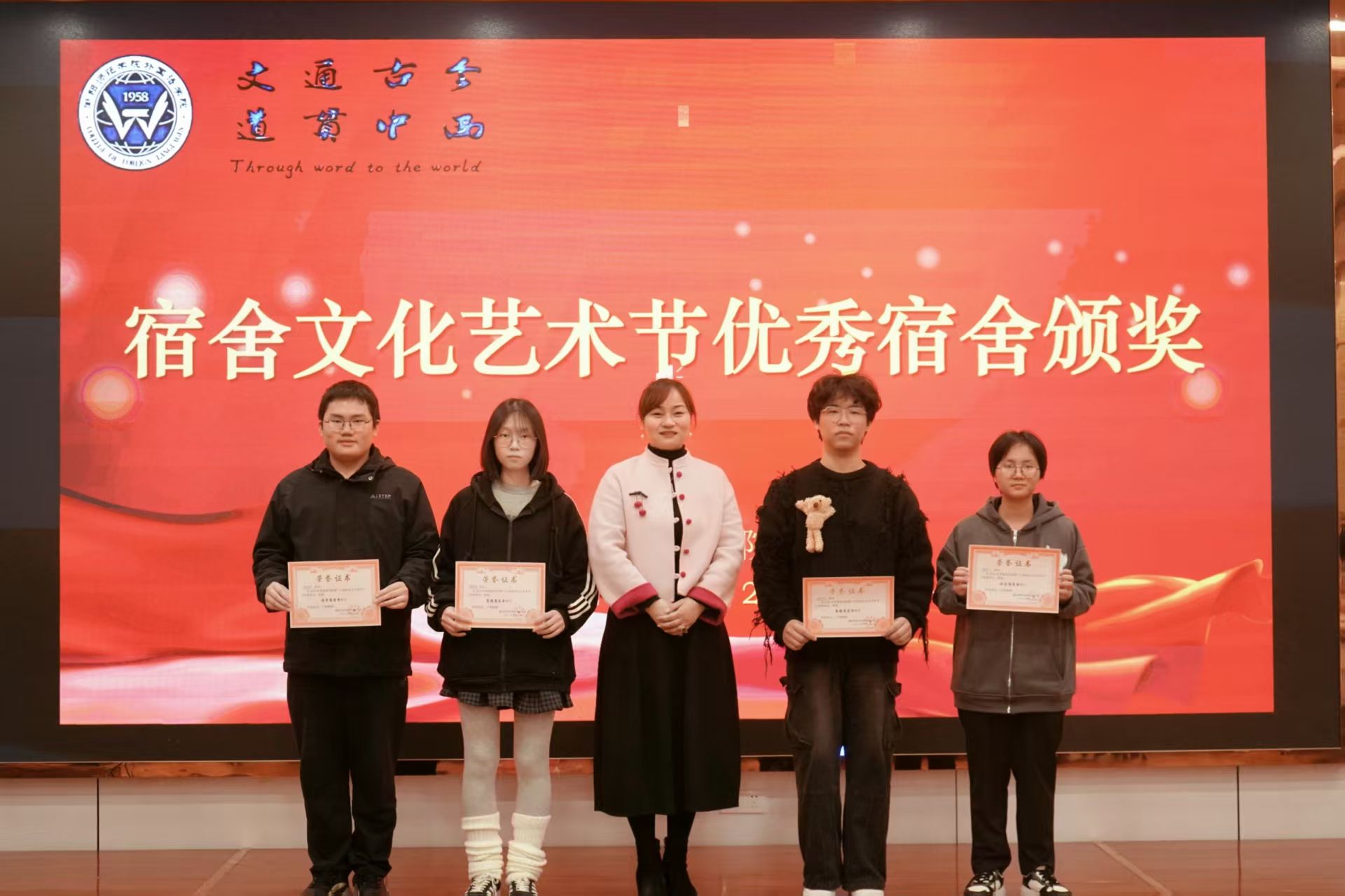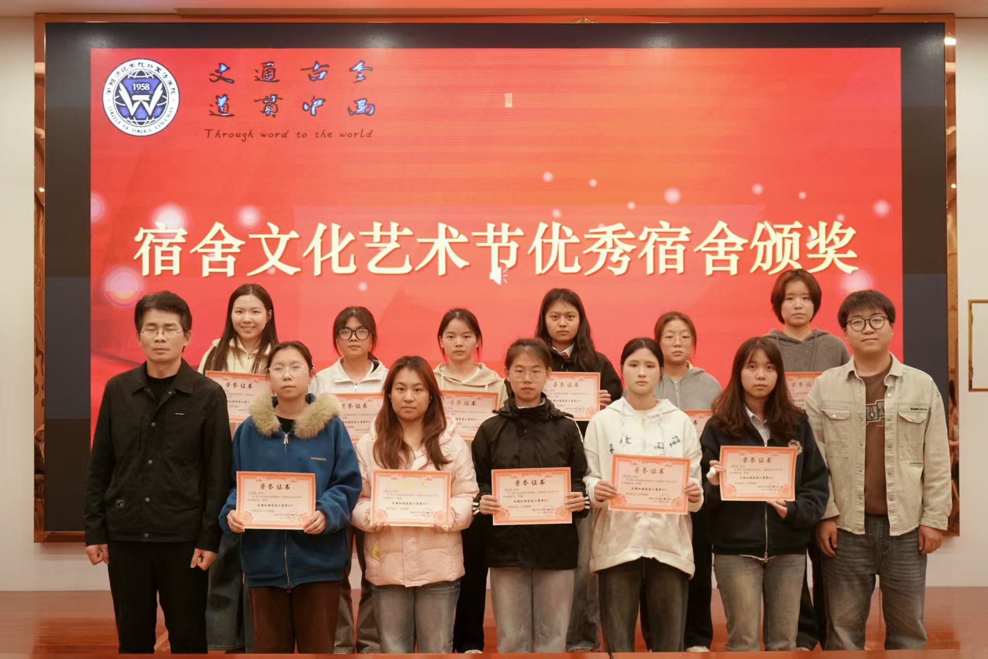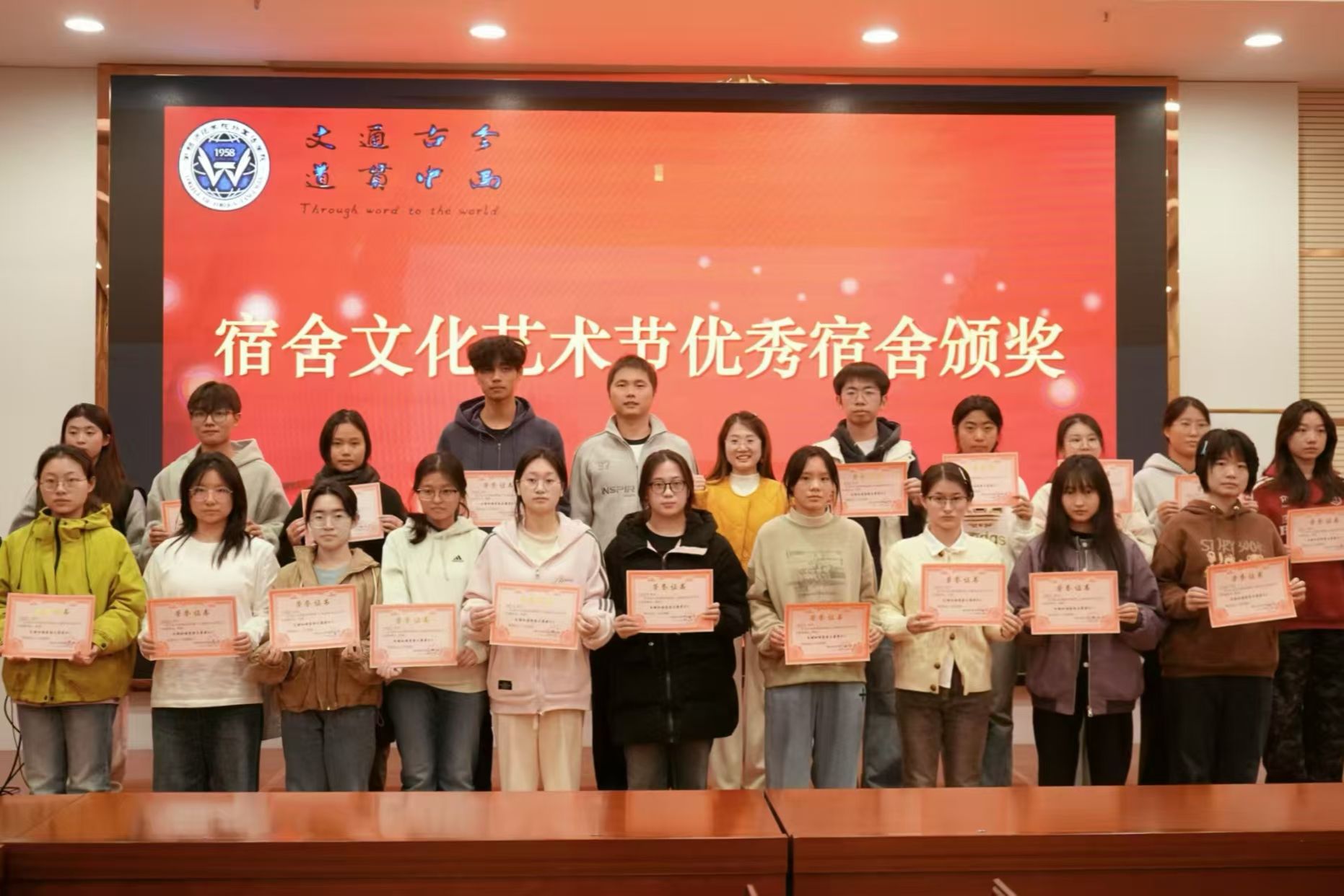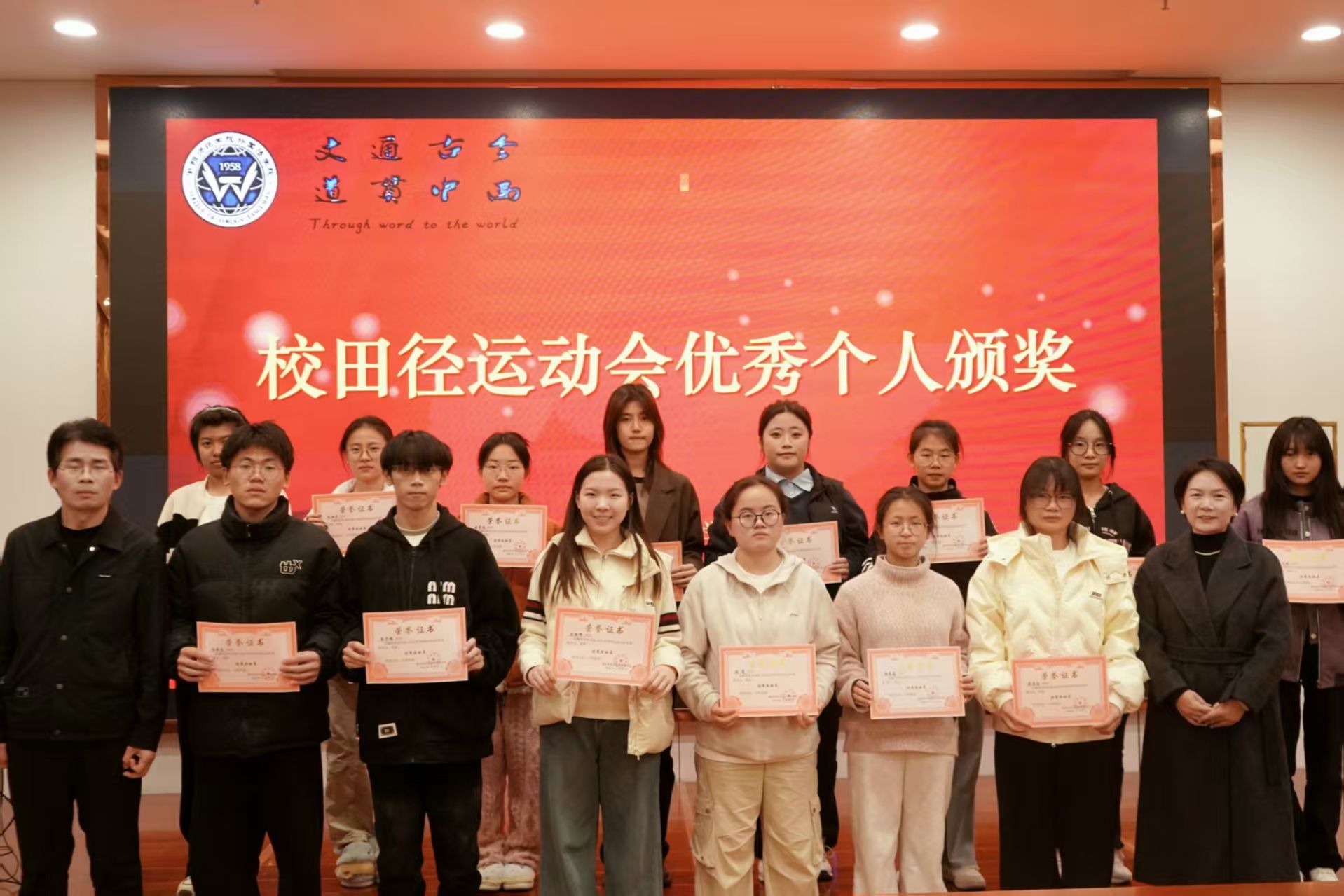 随后,学院领导、辅导员依次为优秀班级、四型宿舍、优秀宿舍、校田径运动会优秀工作者、优秀运动员颁奖、祝贺,并合影留念。