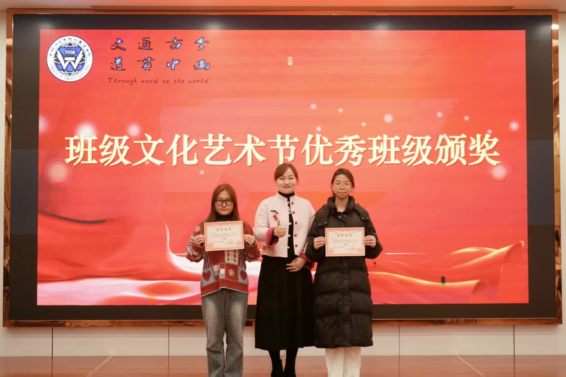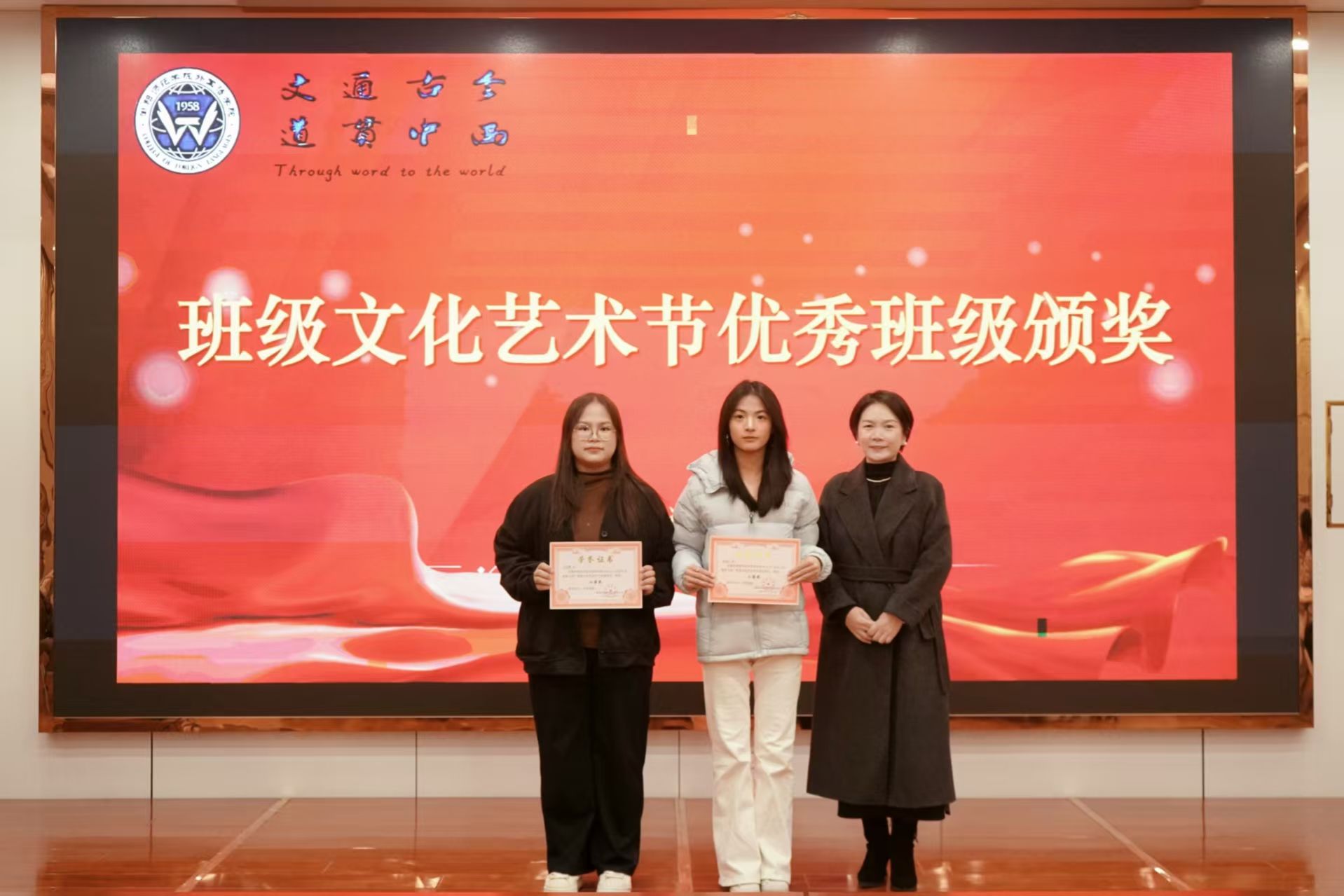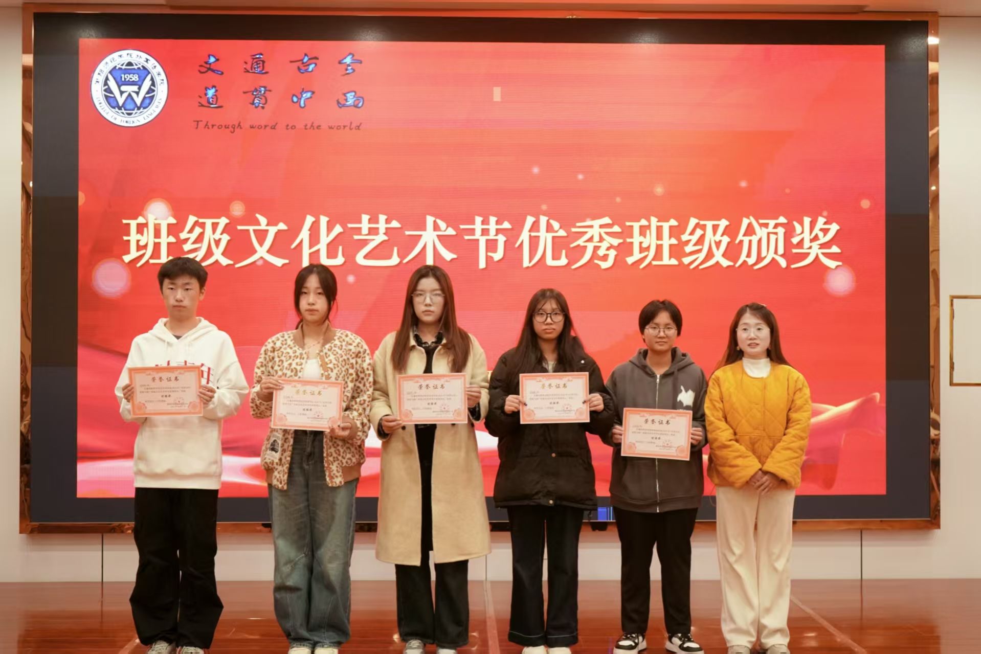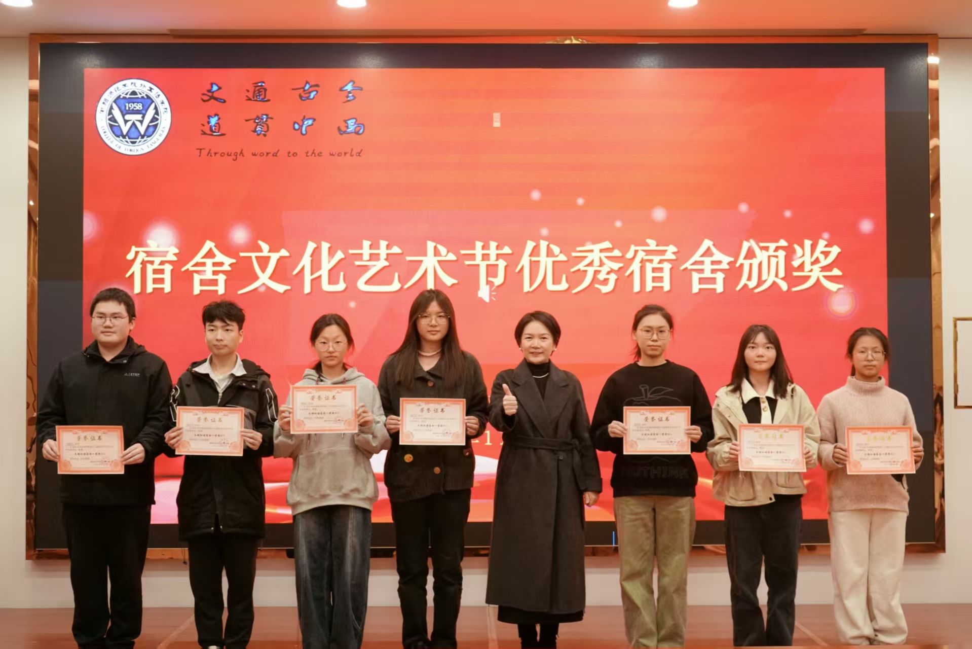 随后,学院领导、辅导员依次为优秀班级、四型宿舍、优秀宿舍、校田径运动会优秀工作者、优秀运动员颁奖、祝贺,并合影留念。