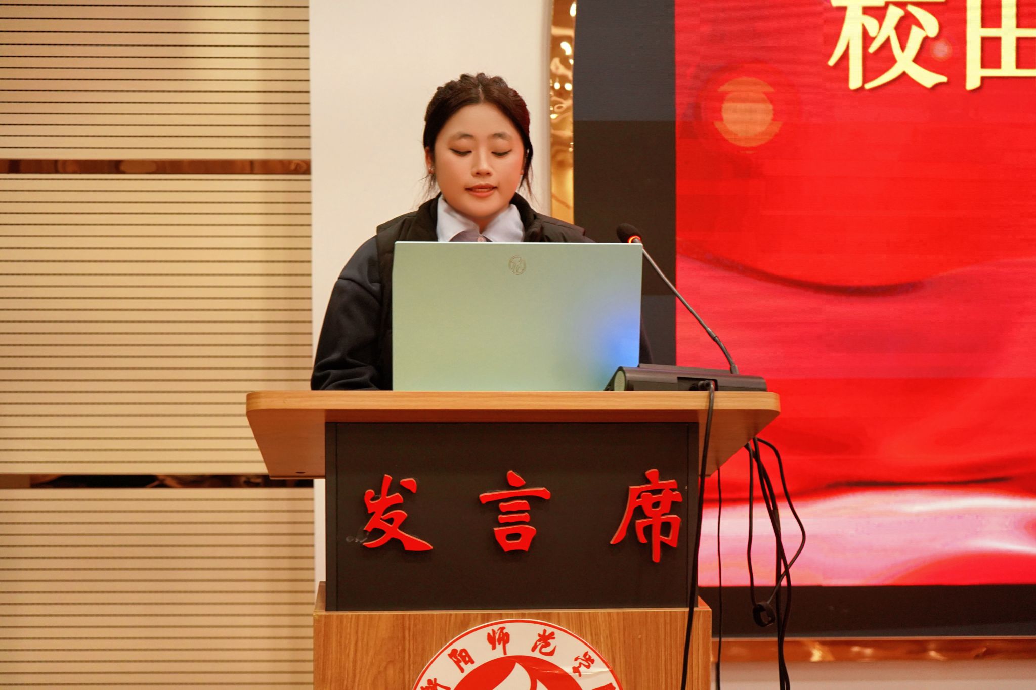 随后,活动进入优秀代表发言环节。班级文化艺术节获奖代表2025级英语4班杨语嫣以班级文化建设理念为核心,分享了班级在文化营造中的探索与收获;宿舍文化艺术节获奖代表2023级商务英语1班唐玮用细腻的讲述勾勒出室友间互帮互助、温暖相伴的点滴日常,传递出宿舍大家庭的温馨氛围;校田径运动会优秀运动员代表2025级商务英语2班王佳琪带领大家重温了运动会赛场上奋力拼搏、突破自我的精彩瞬间,展现了青春昂扬的运动风采。