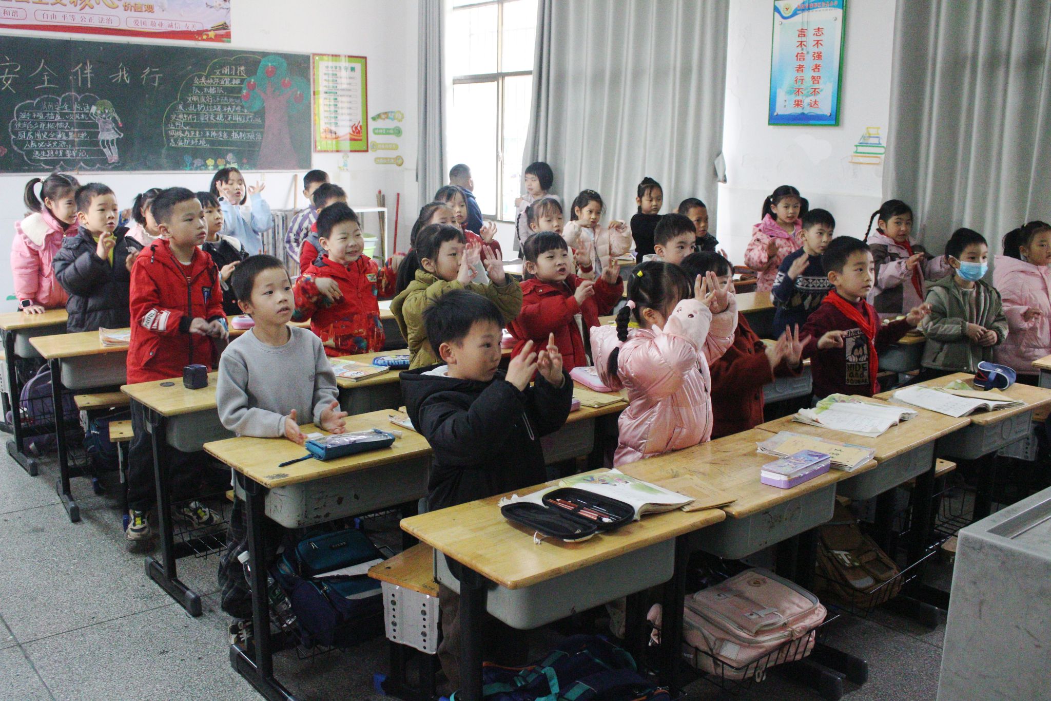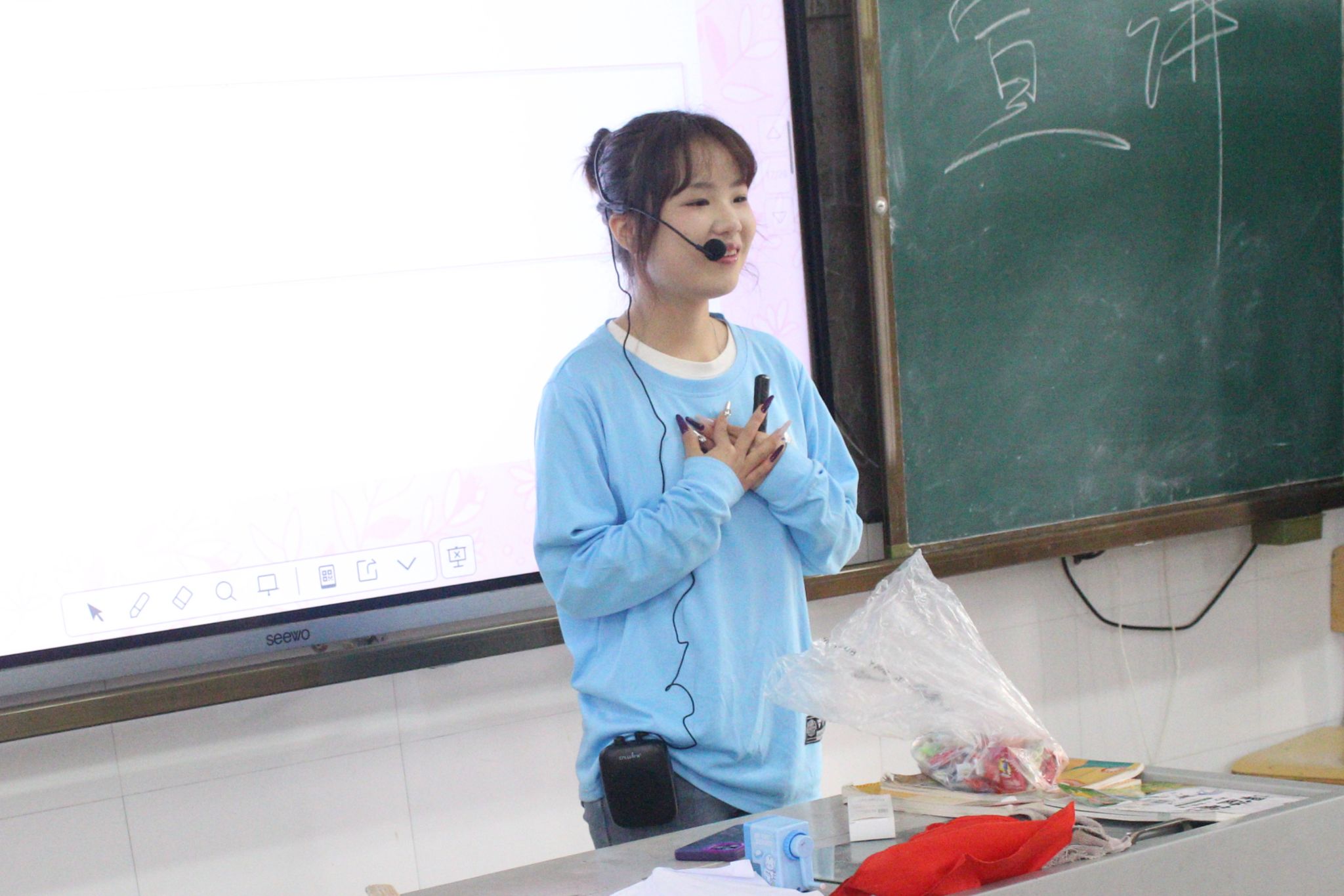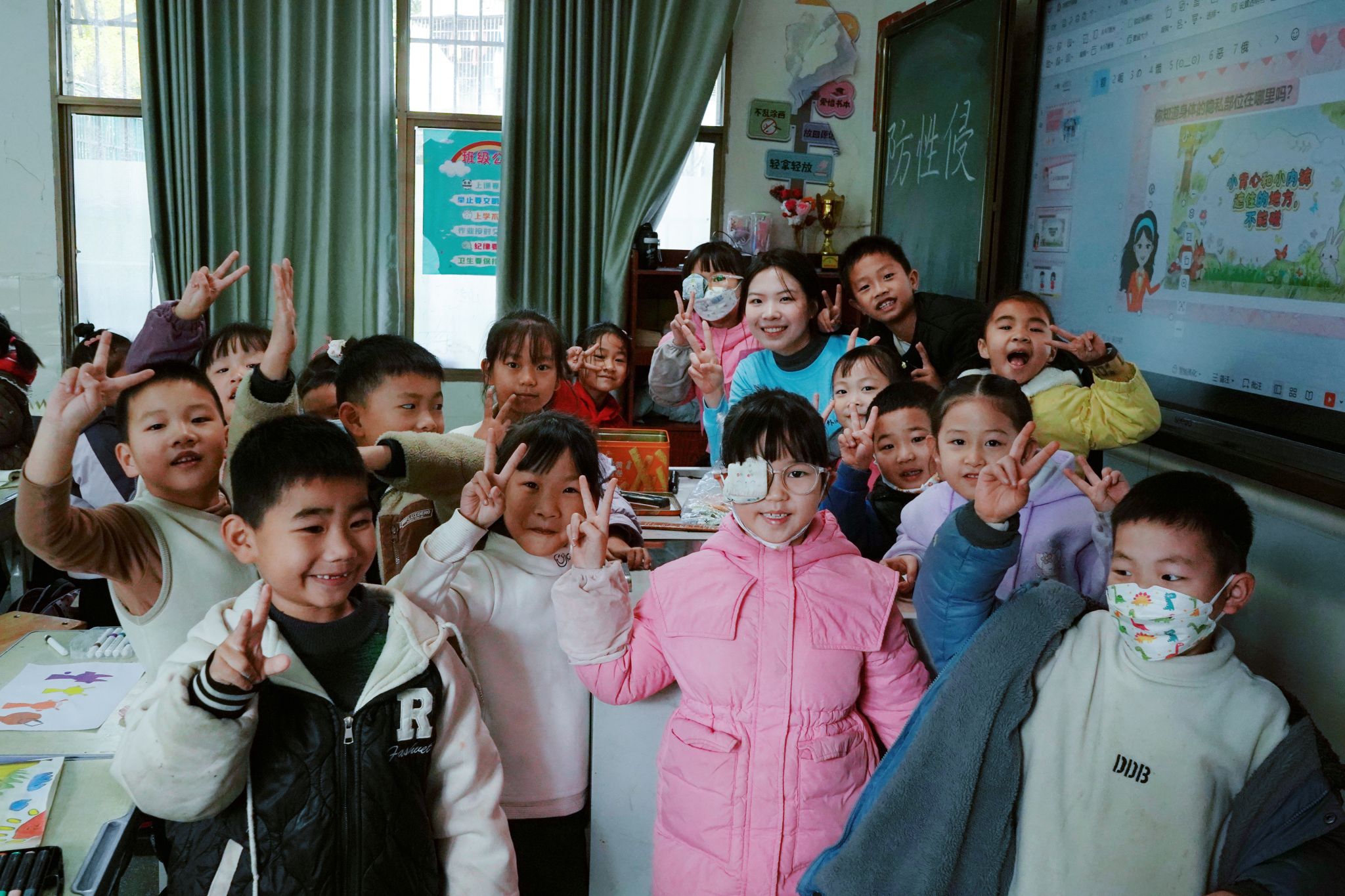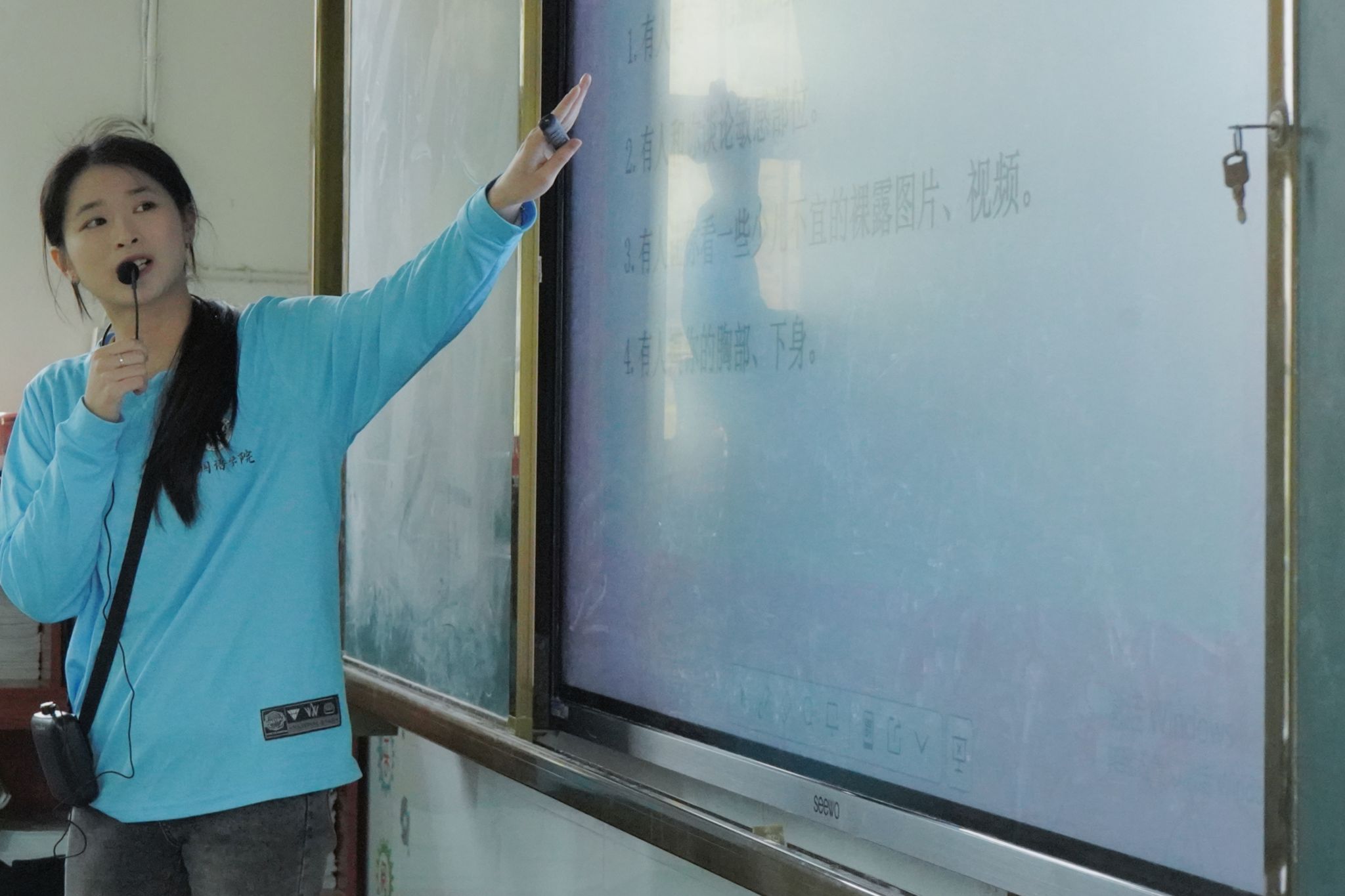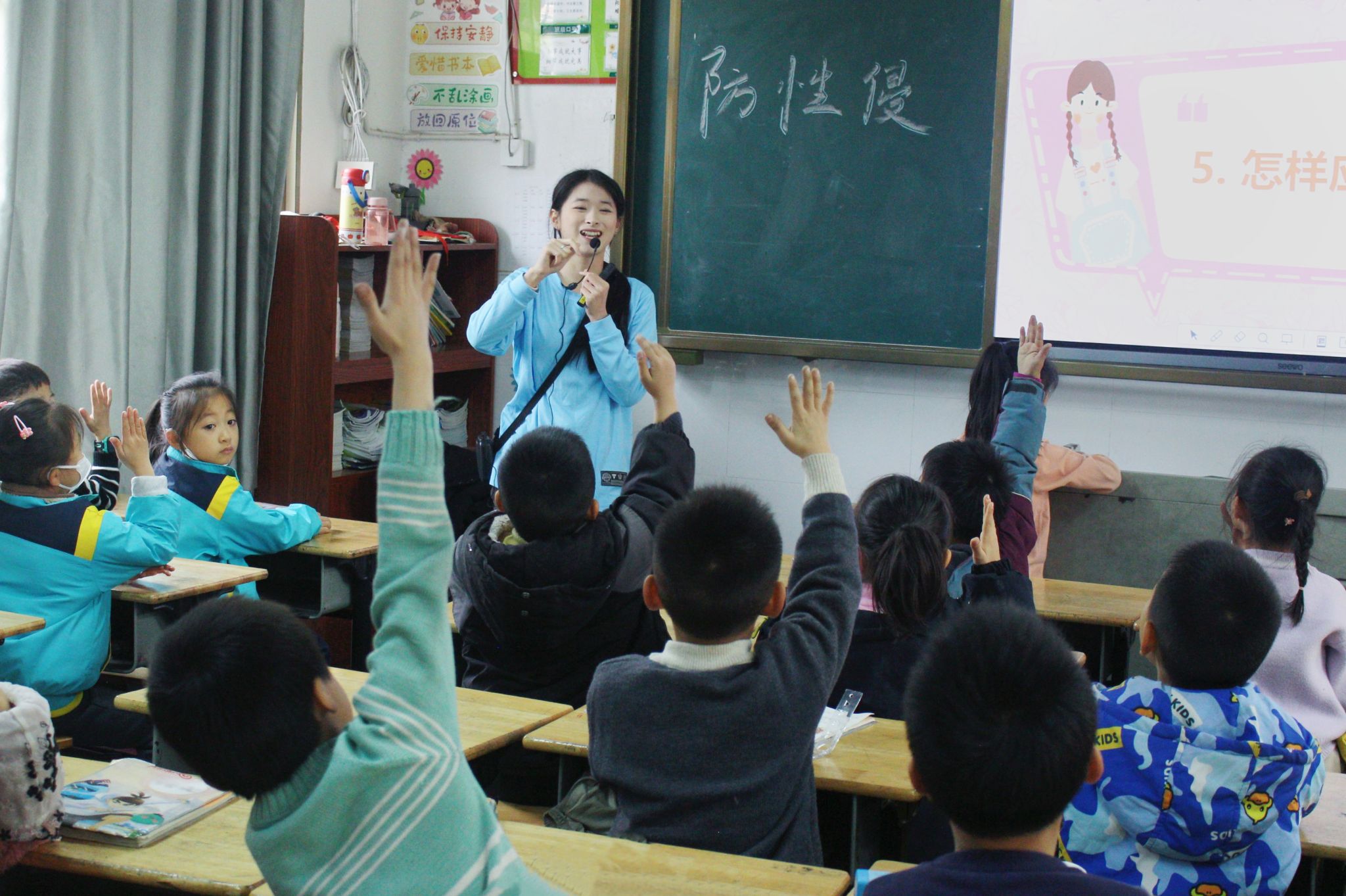 后半段课堂里,宣讲团结合专业特色,将英语操融入安全教育:“Baby有个小肚肚,上上下下要保护……”欢快的节奏配上活泼的肢体动作,安全知识变成了朗朗上口的歌谣。孩子们跟着律动摆动手脚、大声跟读,防性侵的意识也跟着旋律在心里慢慢扎根。到了随堂问答环节,孩子们逻辑清晰地抢答,每一个认真的回答都能换来一颗甜糖果,这份小甜蜜,让安全意识的种子在心里扎得更牢。