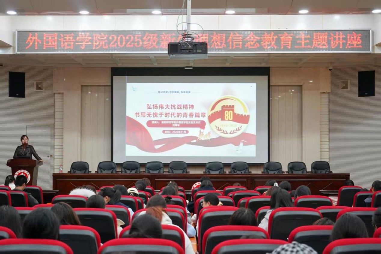 为弘扬伟大抗战精神,书写无愧于时代的青春篇章,帮助同学们筑牢信仰根基,11月3日19:20,太阳成集团tyc33455在外语楼北311报告厅先后开展两场2025级新生理想信念教育主题讲座。学院党总支书记贺琴琴授课,带领2025级全体新生缅怀革命先烈,树立远大理想,担当时代责任。