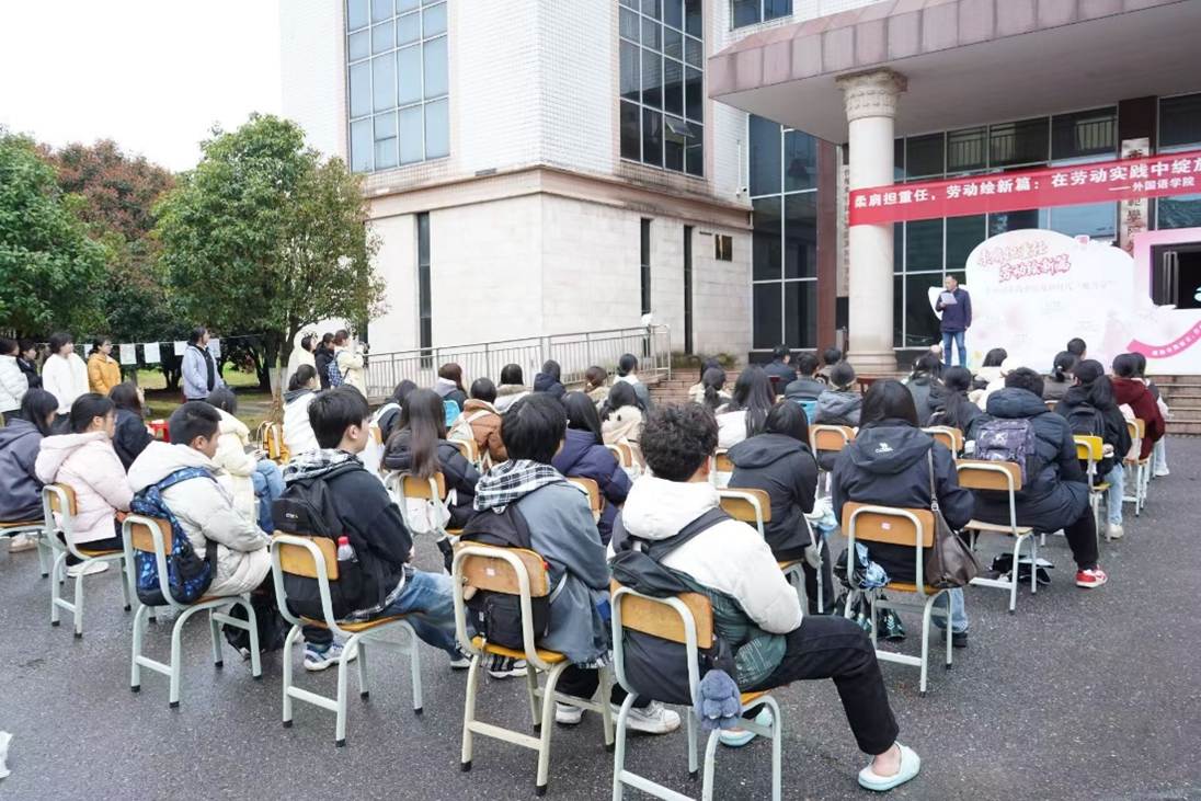 学生代表刘沐阳在发言中分享了她眼中的劳动与成长。她结合“她世界”平台与外语专业特色,分享了在志愿帮扶、文化传播中践行劳动精神的感悟,介绍了系列劳动实践活动,并倡议同学们以实干书写青春担当,让家国情怀在劳动中落地生根。