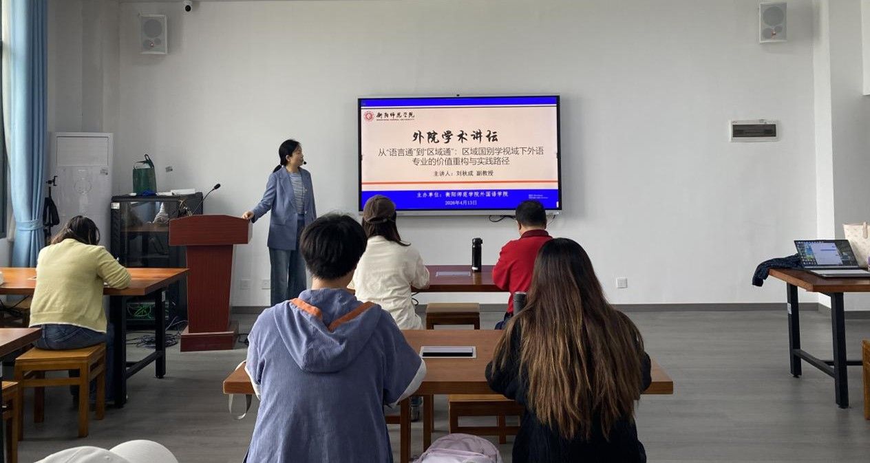 2026 4 13 日下午 3 时,刘秋成副教授受邀在东校区外语楼北 504 教室,作题为《从语言通区域通:区域国别学视域下外语专业的价值重构与实践路径》的学术讲座。学院部分教师及2024级、2025级研究生到场聆听,共同研讨新时代外语学科转型发展的全新路径与发展方向。